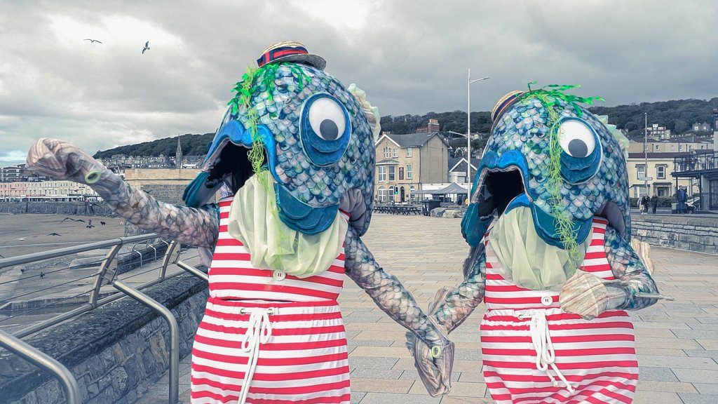 With the glistening heads of giant fish and the shapely, strutting legs of humans, these two deep-sea chums are making their way inland for the very first time. They are curious, slightly confused by "dry land" etiquette, and ready to make a splash without ever stepping foot in a pool.